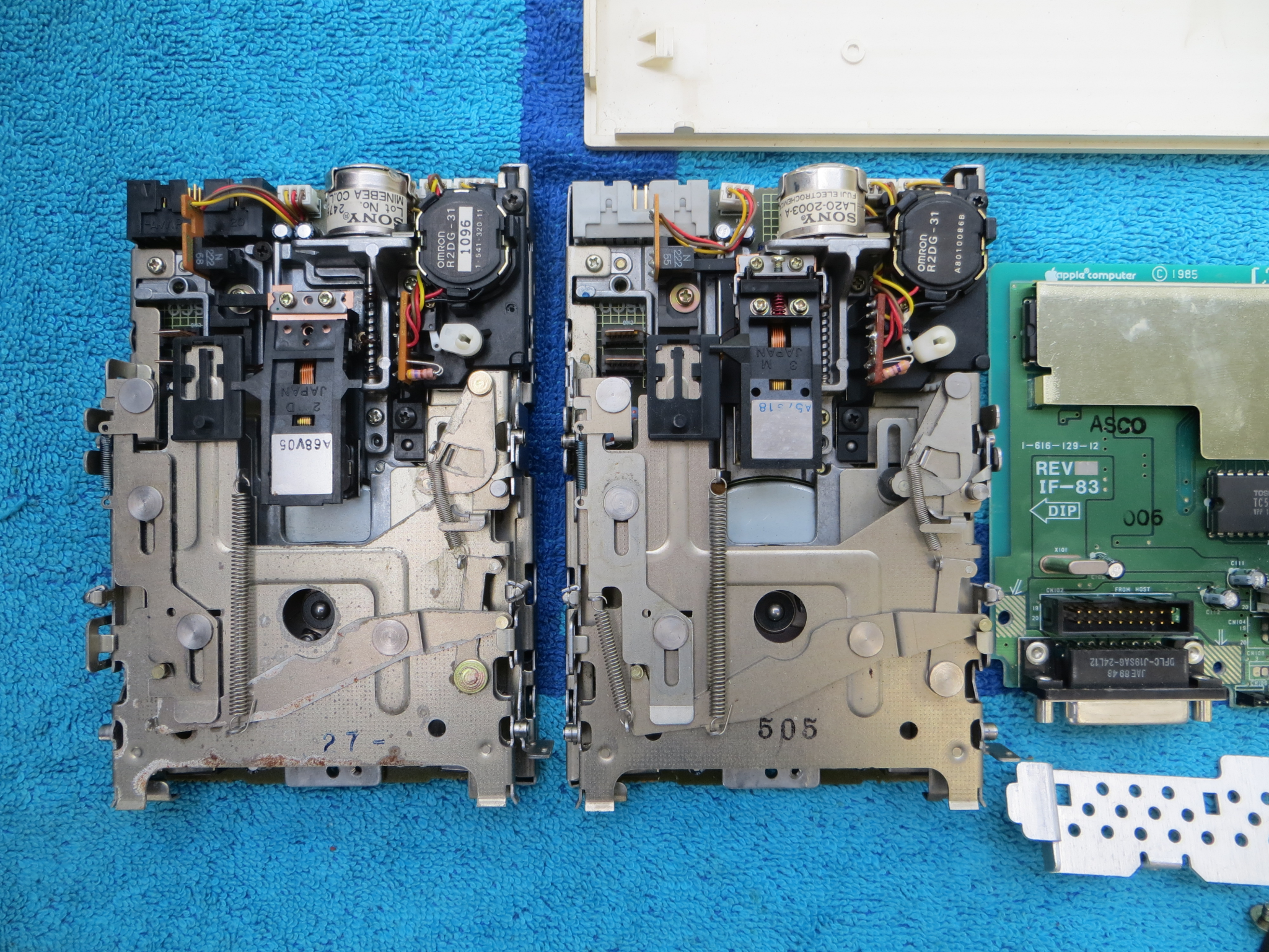 It has 4 electrolytic capacitors (C75, C76 and C77 are all 25v 22uF 85 deg C; the unlabeled one near the interface selector header pins just above the NuBus connector is 25v 47uF) and like the majority of stuff developed at the time uses exclusively through hole parts just like the 128K through the Macintosh SE, and appears to be dual layer card at most, but a 4-layer PCB is a possibility. Note the bodge wires in the images below -- considering this is a Revision J, which is the earliest revision that Apple indicates, that wouldn't be unusual, considering that the early EtherLink/NB models also had same bodge wires. A package is included in the box with hardware to affix the 10BASE-5 drop cable connector, or the T fitting for 10BASE-2.