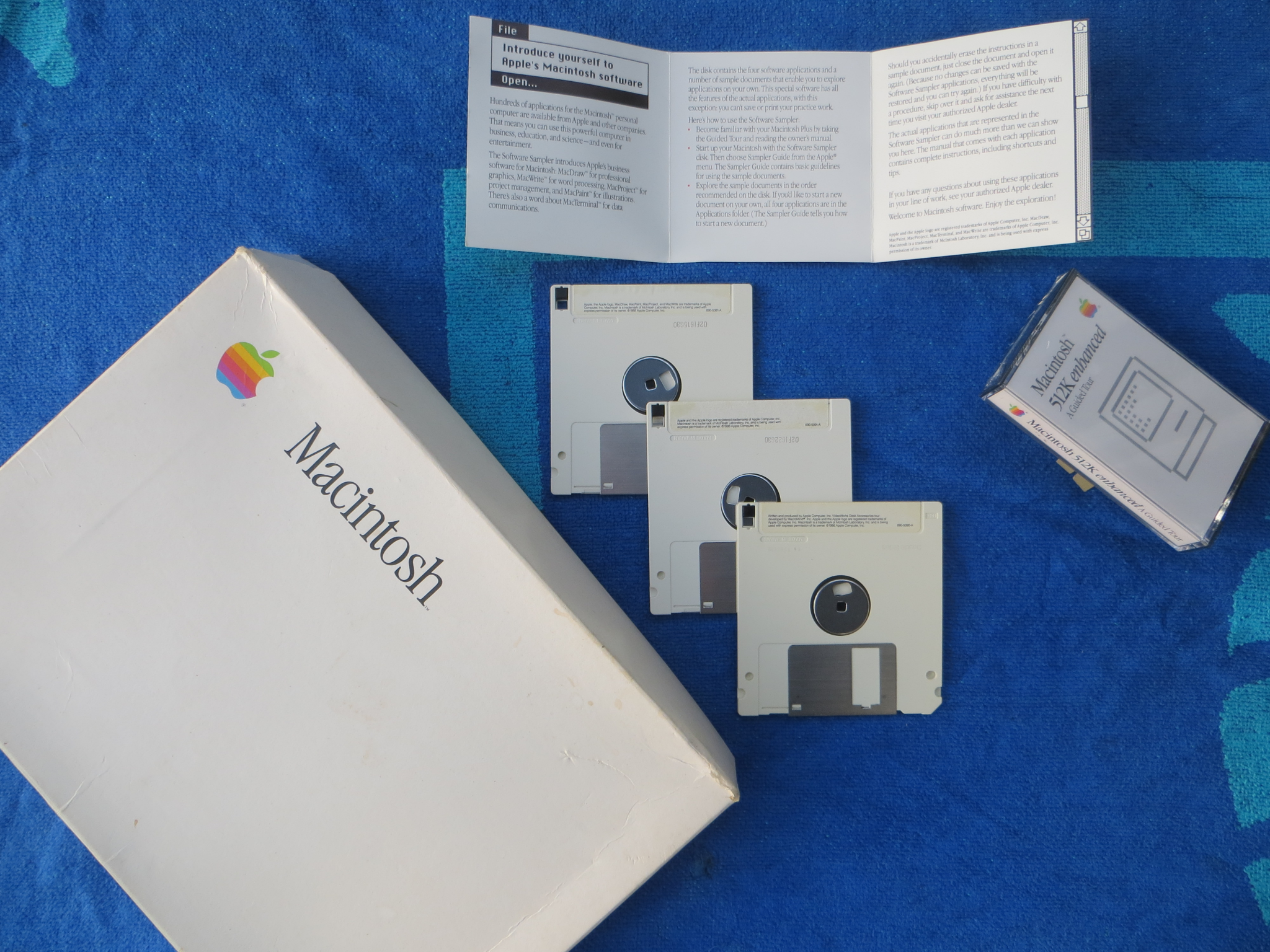 | Disks for a new 512Ke 800KiB | Disks for a new 512Ke computer: System Tools, Guided Tour and Software Sample, all bootable. Audio cassette is still shrinkwrapped, and no cassette player is around, so no archive is possible. Packaging image 1 and image 2. Guided Tour may not be an unmodified image: all were imaged exactly as received |