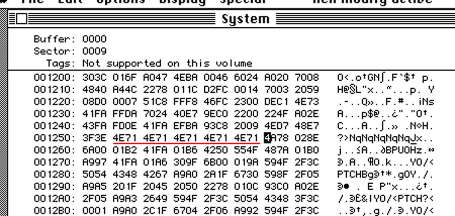 Now here is the patch. There are 10 bytes total. You need to replace them with the machine language instruction for NOP which is 4E71. This NOP will be repeated five times.