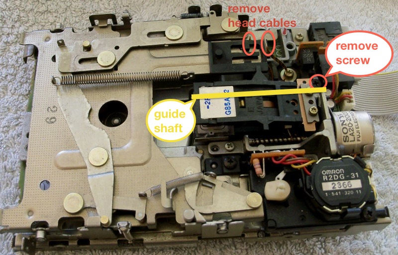 Sometimes it is necessary to remove the head assembly and clean the smooth shaft and guide hole. This probably shouldn't be lubricated when re-assembled. In the third pic, the shaft placement is in yellow. Remove the two head cables carefully by pulling straight up. then remove the screw at the end of the shaft. Clean the shaft and the two holes in the head assembly that it feeds through and re-assemble.