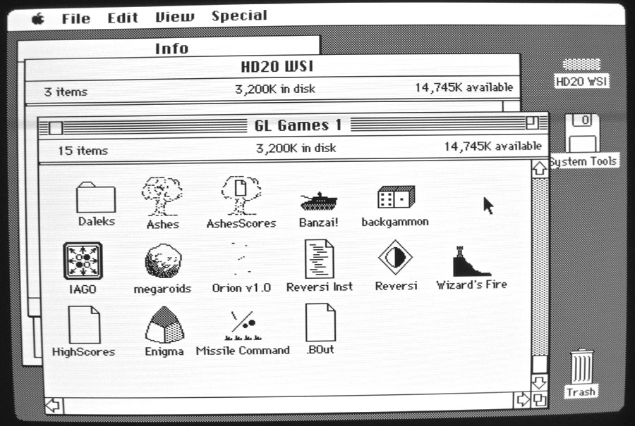 The previous owner left a folder full of games for me! Here are some real classics: Reversi, Backgammon, Banzai!, Iago, Megaroids, Missile Command, and more.