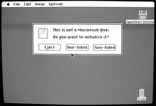 3.) Eject the boot disk from step 1, and insert your disk to be initialized into the 800K drive. Either choose Erase Disk from the Special menu, or follow the initialization dialog if the disk had never been formatted for Macintosh.
