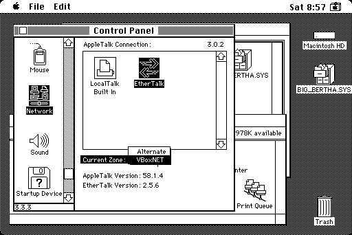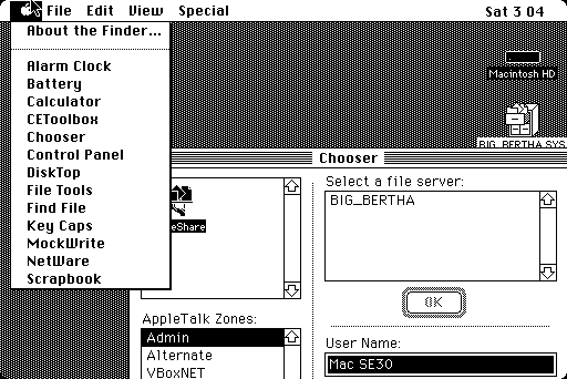 Blue Box is an emulation environment for a version of Mac OS 8, depending on which version of Rhapsody is involved. For Rhapsody 5.6, it is a version of 8.6 and it has the usual ability to connect with AppleTalk as a normal system with 8.6 would, and the file server functions normally. Strangely however, it would not connect to any OS X server above 10.4. Servers in both environments are discrete. Some other random musings about this operating system are found in the appropriate More Info section. - Sabina TCP stack: This a project by D. Finnigan, also known as Dog Cow, the owner of Mac GUI. It is designed to be fully compatible with the Macintosh 128K, and for that matter, any Mac with a built-in serial port, and should be compatible all the way back to System 0.85 / Finder 1.0. It is supposed to feature a FTP, Telnet, HTTP download tool and a POP3 email client. Completion date is unknown; at time of publishing, the project is not completed yet. It must be mentioned that this kind of work is not easy, supported only by personal reasons and the number of people who can do this kind of thing today and have the desire to do it is very small in number (think single digits). It requires specialized in-depth knowledge of a number of different technical disciplines and low level MC68000 assembly language knowledge.