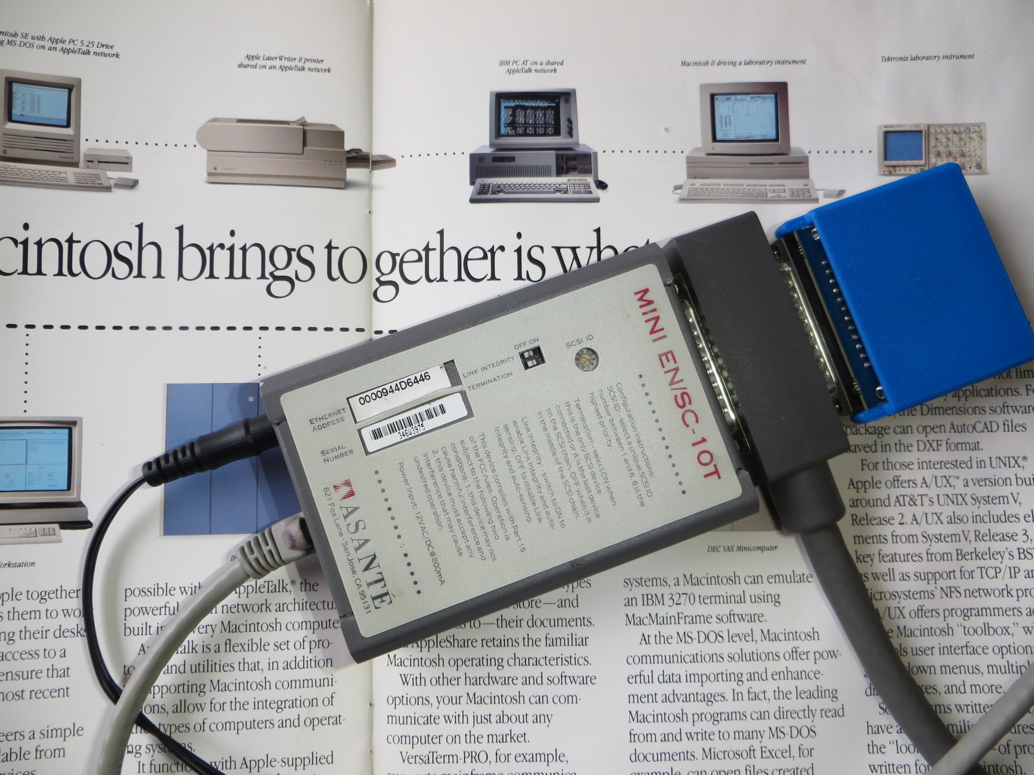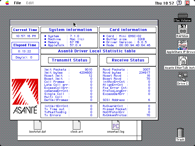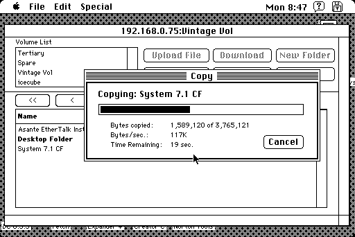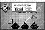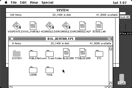 Gamba has prepared an interesting table here that describes some alternative applications that can mimic AFP networking. Of those, only EasyShare is examined. JC Remote is very unstable and can only link up to another computer with JC Remote installed. - Pre-MacTCP TCP options: MacTCP was an extension of MacIP, which started Kinetics Internet Protocol (KIP), based on the idea of transporting TCP/IP information over AppleTalk via the serial port. Development for MacIP started in late 1984 by a few individuals. Some of these are 128K compatible. An example photo can be found here. May have issues. Two other options was Columbia AppleTalk Package (CAP) and IPTalk, which was acceptable for Cisco routers back in the day to route AppleTalk to WANs. One example of a Cisco router would be the popular 2500 series, a type of rack-mounted platform of multiprotocol routers (other types were available, i.e. router/hub, access server, etc) to handle Ethernet via AUI, Token Ring, ISDN or synchronous or asynchronous serial interfacing. First-generation AGS and MGS level stuff is a different story: see this document, PDF page 199, or document page 520-465.