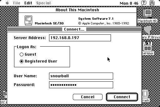 A Macintosh Server G3 running 8.1 (it doesn't go down to 8.0) mounted 10.14 Mojave and exchanged files no problem. Basilisk II, which emulates a 68030 (IIci) or 68040 (Quadra 900) was able to connect to 10.14 with as a Quadra 900 and 8.1. This is probably because Basilisk II brings quite a few patches to the Mac OS ROM code. - Mac OS X 10.0: Stability can be questionable: any hardware that can run this OS can run Jaguar, but on a slow G3 Jaguar is noticeably slower. It still works fine with Netatalk and Windows 2000 Server with SFM, but not with PC MacLAN v9 (but PC MacLAN can be a client to a 10.0 server, so it's not a total loss). Clients connecting to a 10.0 server are fine, but 10.15 Catalina is a little different because it can't mount 10.0 Cheetah and 10.1 Puma as a registered user, only a guest (shown with 10.1). Expect to use AFP IP address to connect to servers in the Network browser. Apple says that 8.6 and earlier cannot be mounted by a 10.0 client, which only uses AFP over TCP/IP, and they state OS 9 and/or AppleShare IP works. But ShareWay IP does work both ways using 7.5.5, which can also be installed on 8.1 and 8.6 to allow AFP file sharing over TCP.
