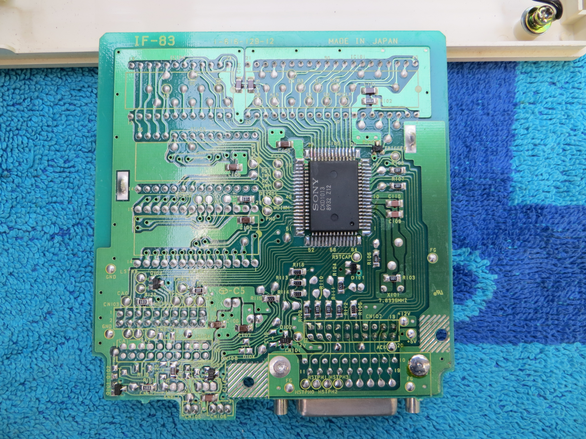 It has 4 electrolytic capacitors (C75, C76 and C77 are all 25v 22uF 85 deg C; the unlabeled one near the interface selector header pins just above the NuBus connector is 25v 47uF) and like the majority of stuff developed at the time uses exclusively through hole parts just like the 128K through the Macintosh SE, and appears to be dual layer card at most, but a 4-layer PCB is a possibility. Note the bodge wires in the images below -- considering this is a Revision J, which is the earliest revision that Apple indicates, that wouldn't be unusual, considering that the early EtherLink/NB models also had same bodge wires. A package is included in the box with hardware to affix the 10BASE-5 drop cable connector, or the T fitting for 10BASE-2.