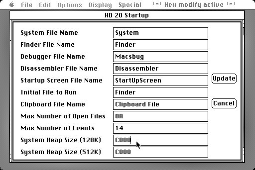 Enter C000, the same heap size as for a Mac 512K. This will yield a 48K system heap. Click Update to write this modified boot block.