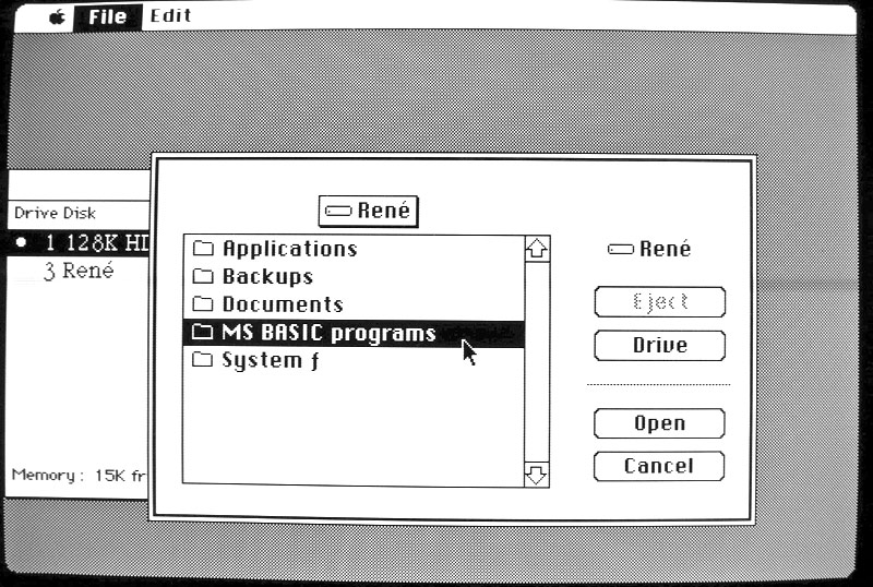 But then you will get a System Bomb with ID = 15. That's a Segment Loader error, and it means there's not enough free memory to load the Finder. Here's another reason why the Mac 128K was cut off from the Hard Disk 20!