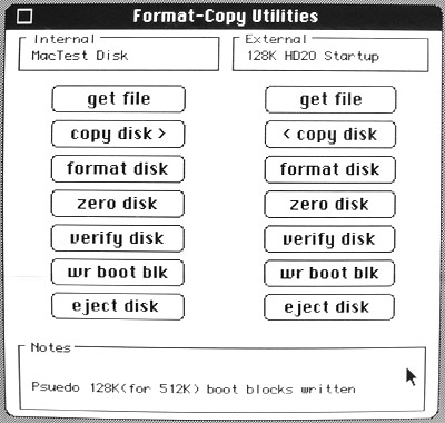 Because I don't have a Mac 128K, I did my experiments using pseudo 128K boot blocks. Larry Kenyon's Disk Copy/Utility application has an undocumented feature: hold Command and Option while you click the wr boot block button. This will install a custom boot block that makes your Mac 512K look like it only has 128K of RAM. It reduces the size of the application heap.