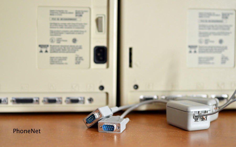 MacIP will run on the Mac Plus too. To connect a Mac 128K or 512K to the Plus, use an Apple DE-9 to mini DIN-8 serial cable, as pictured below. Otherwise, if you are using PhoneNet cabling, you need no other hardware or cables.