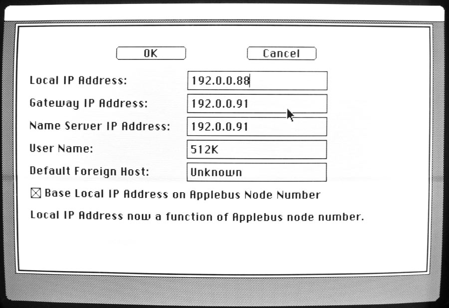 The only configuration field that matters here is the first one, Local IP Address. MacIP will pick an IP address based on your Mac's AppleTalk node ID. AppleTalk nodes range from 1 to 255, so this will become the last octet of your IP address.