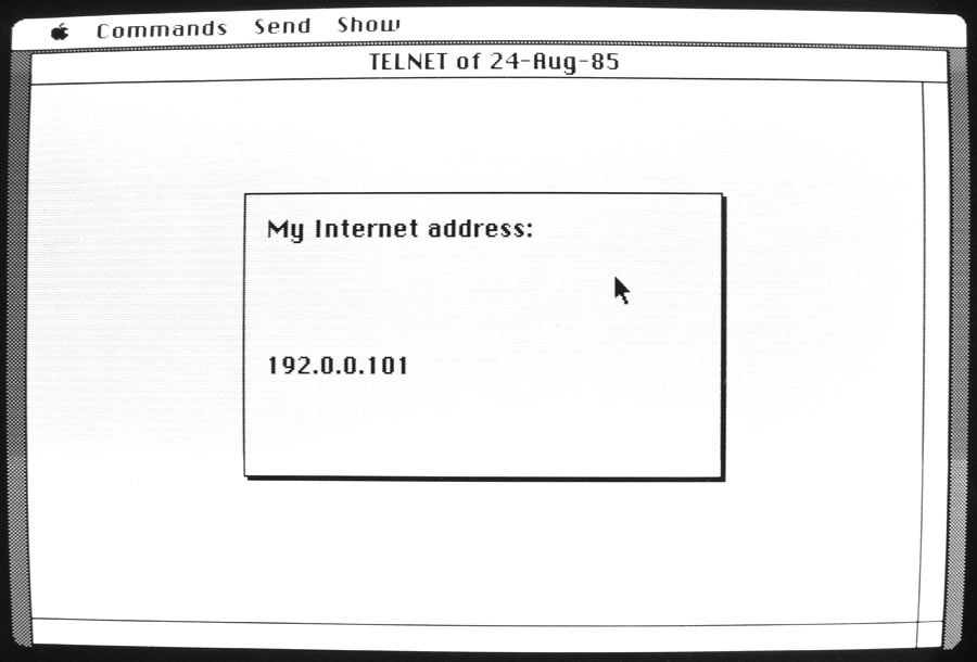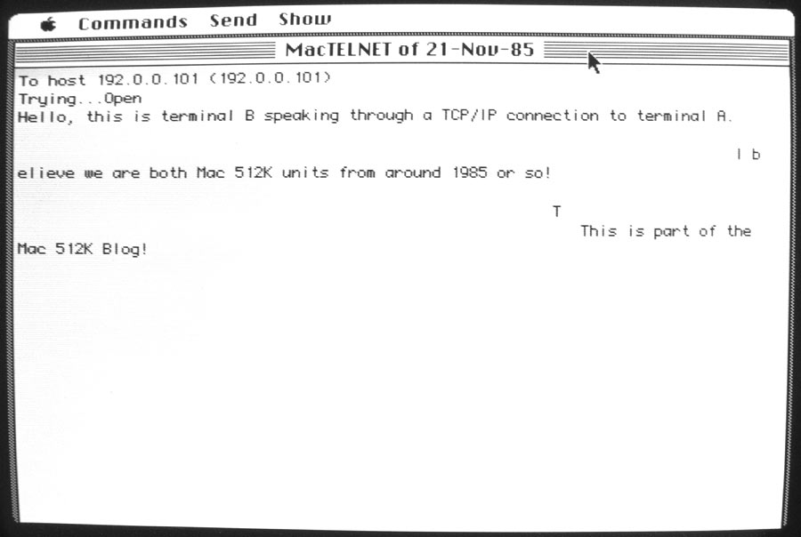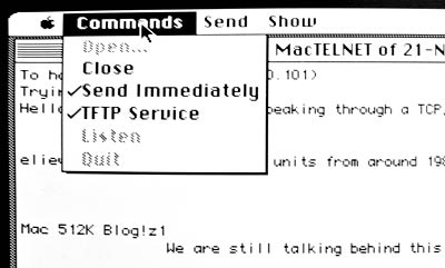 That's about it for Telnet. Unless you manage to get MacIP connected to a Unix box, you're limited to typing messages between two Macs. Telnet has a built-in TFTP client, or you can use the stand-alone tftp application to transfer files between Macs running MacIP. I'm not covering tftp in this Mac 512K Blog article.
