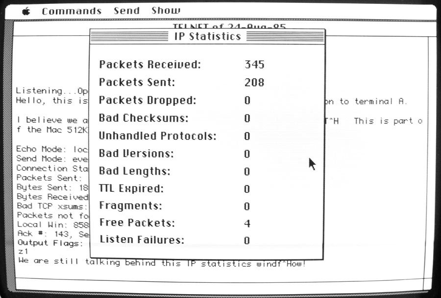 To see IP statistics, choose IP Statistics from the Show menu. The November 1985 version of Telnet has these two commands disabled to allow Telnet to run on a Mac 128K. Try running Telnet from August 1985, which has these statistics commands enabled.