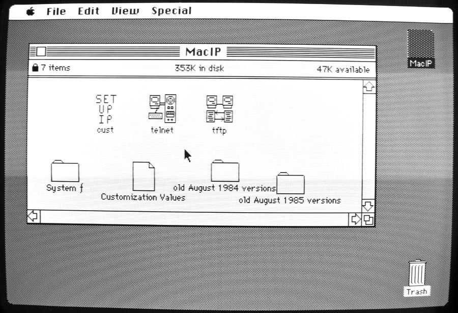 By the end of August 1984, Mark had three applications ported and running on the Mac: TFTP (trivial file transfer protocol), TIME (a remote time synchronization service), and CUSTOMIZE. This latter application was used to set local IP address, gateway, and other IP configuration information.