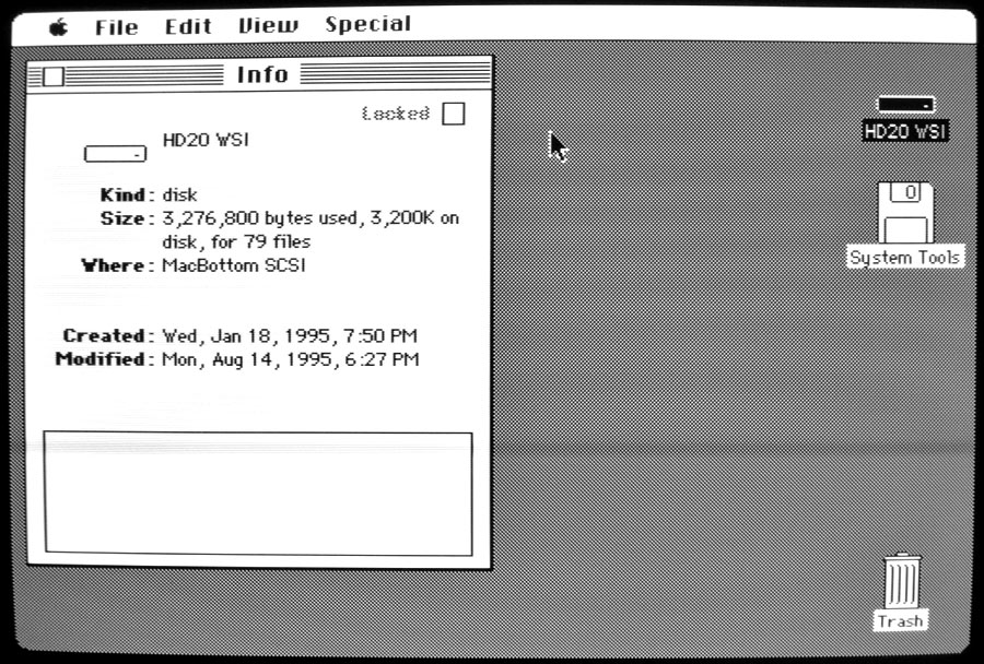 The hard drive contained a working System folder and I started right up and arrived at the desktop. If the last modification date is to be believed, this hard drive was last used in August 1995, about 22 years ago.